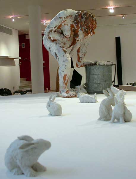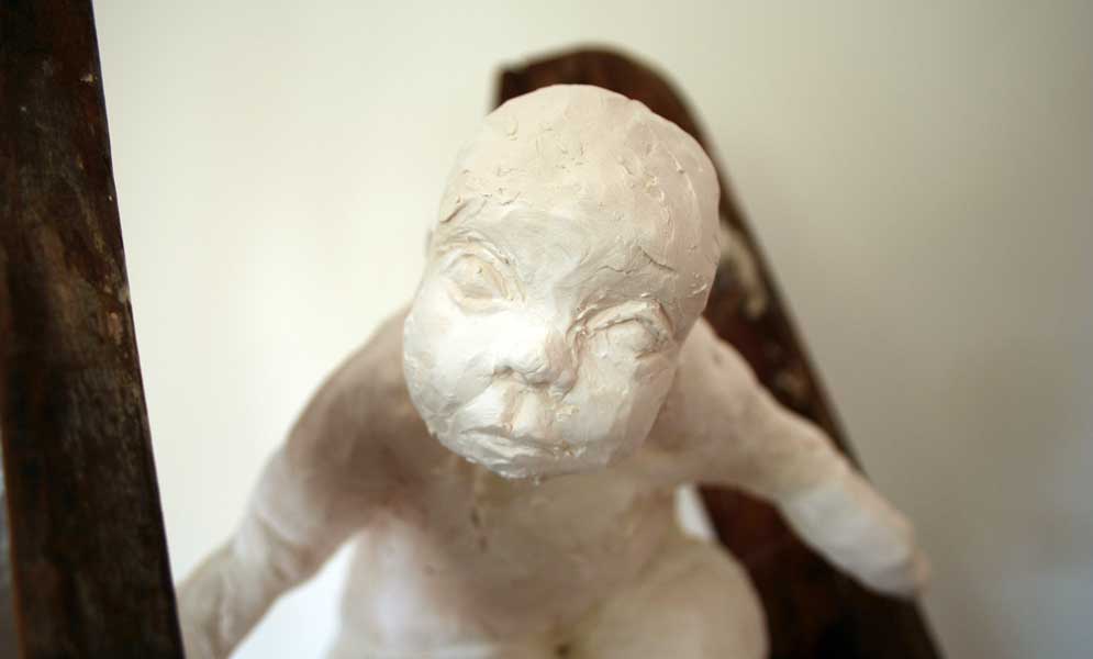 Myths, stories and poems have a strong influence on my work. Seamus Heaney’s poem Bye Child was the main influence and inspiration for The Hen House Boy Series 2006. William Hogarth’s etchings highlighted the story of Mary Tofts; convincing everybody including the king that she was giving birth to rabbits Mary Tofts 2003.